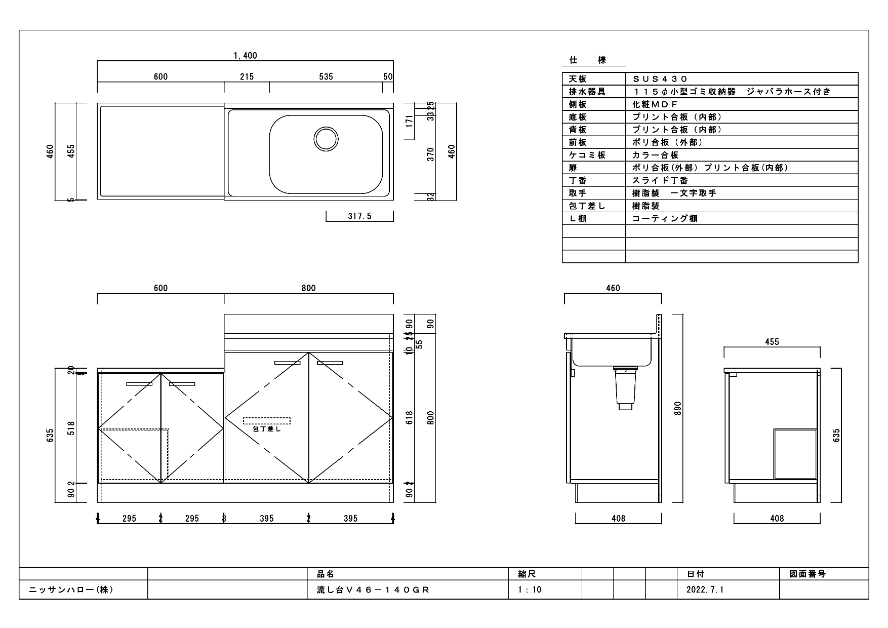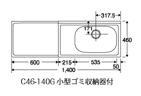 V46-140GR(右水槽)W1400xD460xH800+90mm)