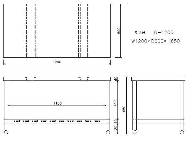 【東製作所】 [組立式] 業務用 ステンレス ガス台 HG-1200 W1200xD600xH650mm