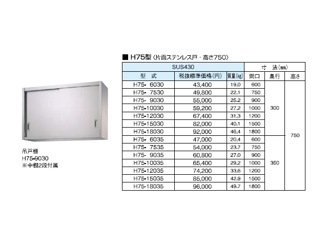 潟Vンコー製の業務用 ステンレス吊戸棚、H75-12030 新品です。